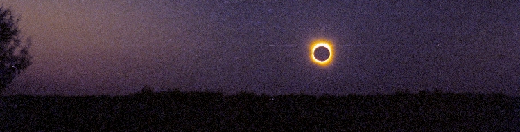 We synchronised watches - with Jon's GPS receiver of course. We saw first contact within seconds of the predicted time. We watched as the moon glided upwards across the sun's face, starting just to the left of the lower limb. We had 57 minutes of partial phase giving plenty of time to take photos and check cameras. We noted the changes to shadows as the sun changed shape. We made a number of impromptu pin-hole cameras in a flurry of optical experimentation. As the sun slipped away the lighting took on that wierd quality only seen when it comes from a narrow crescent. The temperature had been 32 C all afternoon; we noticed a four-degree drop during the partial phase. Just minutes before totality "all the animals acted strange". Well, a pair of budgerigars flew by looking irritated, and the humans had been acting strangely all day.