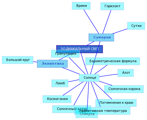 Слабое сияние, протянувшееся вдоль эклиптики. Лучше всего его видно сразу после окончания или непосредственно перед началом астрономических сумерек в той части неба, где зашло или восходит Солнце. Это сияние возникает из-за рассеяния солнечного света на межпланетной пыли, сконцентрированной в плоскости Солнечной системы.Сурдин В.Г., ГАИШ, Москва