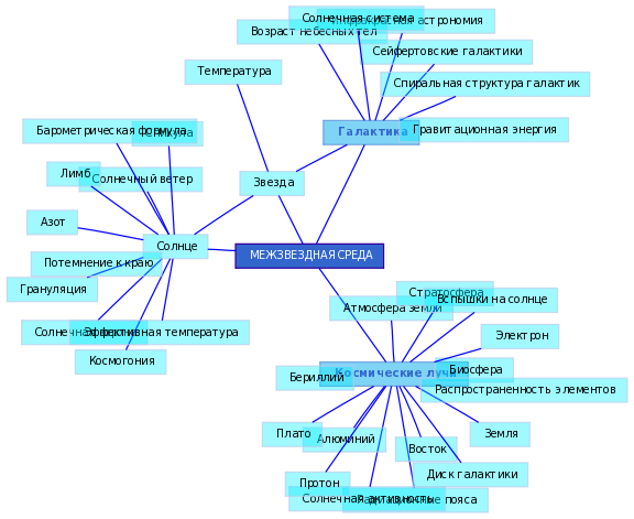 Разреженное вещество, электромагнитное излучение и магнитное поле, заполняющие пространство между звездами в Галактике. Основные компоненты межзвездного вещества - газ, пыль и космические лучи, причем газ обычно составляет не менее 90% массы; остальное вещество сосредоточено в межзвездной пыли. Масса космических лучей ничтожна, но их влияние на остальные компоненты межзвездной среды весьма ощутимо. Характерная плотность межзвездного вещества - 1 атом в кубическом сантиметре, но вследствие огромного объема галактики полная масса этого разреженного вещества в ней достигает миллиардов масс Солнца. Доля межзвездной среды составляет менее 1% массы у эллиптических галактик, около 5% у спиральных и более 10% у неправильных галактик. Химический состав межзвездной среды близок к составу молодых звезд (недавно сформировавшихся из нее): на 1000 атомов водорода приходится около 100 атомов гелия и 2-3 атома более тяжелых элементов. При этом значительная часть тяжелых элементов входит в состав межзвездной пыли.