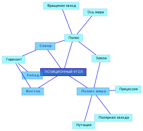 Характеризует взаимное расположение двух светил на небе. Позиционный угол светила A относительно светила B - это угол с вершиной в A между дугой большого круга АB и направлением на северный полюс мира. Измеряется в градусах от 0o до 360o и отсчитывается в направлении против часовой стрелки, т.е. в направлении север-восток-юг-запад.Сурдин В.Г., ГАИШ, Москва