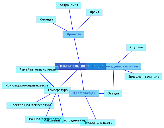 Показатель цвета (Color Index) характеристика спектра излучения звезды; выражается разностью звездных величин, измеренных в двух диапазонах спектра. Впервые был введен в начале ХХ в., когда выяснилось, что относительная яркость звезд на фотопластинках отличается от наблюдаемой визуально (поскольку глаз человека наиболее чувствителен к желтым лучам, а фотопластинка - к синим). Более холодные - желтые и красные - звезды выглядят ярче для глаза, а более горячие - белые и голубые - ярче получаются на фотопластинке. Следовательно, цвет звезды указывает ее температуру.Вначале показатель цвета определили как разность между фотографической и визуальной звездными величинами объекта: CI = mph-mvis. Введение трехцветной фотометрической системы UBV позволило использовать два независимых показателя цвета: (B-V) и (U-B). Поскольку фильтр V (visual) близок к диапазону чувствительности глаза, а фильтр B (blue) - к диапазону фотопластинки, то значения показателей CI и (B-V) почти совпадают. Шкала звездных величин установлена так, что (B-V)=0 и (U-B)=0 для звезд спектрального класса A0 с температурой поверхности около 10000 К. Красные звезды с низкой температурой поверхности имеют показатель цвета от +1.0m до +2.0m, а у горячих бело-голубых звезд он отрицательный до -0.3m. Продвижение в инфракрасный диапазон спектра привело к введению новых стандартных фильтров (I, J, K, ...) и соответствующих им показателей цвета.