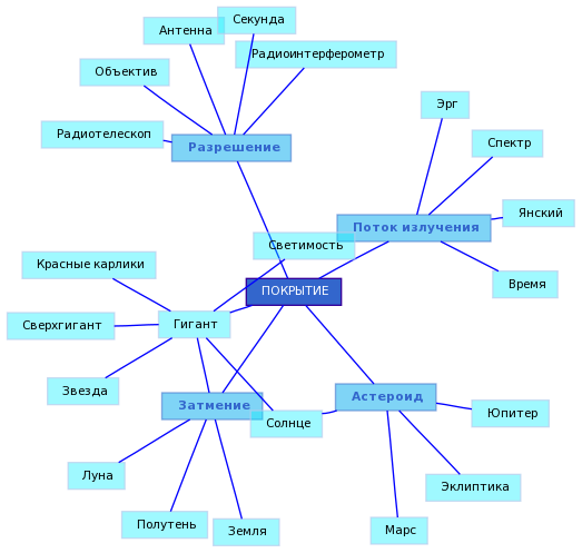 Такое расположение небесных тел, когда одно из них закрывает собой от наблюдателя другое (см. затмение). Обычно покрытиями называют затмения звезд дисками Луны, планет, их спутников и астероидов. Представляют интерес и покрытия Луной самих астероидов и планет. Фиксируя моменты покрытий, уточняют теорию движения Луны. Покрытия Луной важны для изучения тонкой структуры космических источников излучения, особенно в тех диапазонах, где аппаратура имеет низкое угловое разрешение: в 1950-60-е годы это был радиодиапазон, в 1970-80-е - рентгеновский и гамма-диапазоны. Регулярно проводятся оптические наблюдения покрытия звезд Луной для выявления тесных двойных звезд и исследования структуры поверхности звезд-гигантов. Наблюдая, как изменяется поток излучения от источника в момент его покрытия Луной, можно с высоким угловым разрешением (которое определяется временным разрешением приемной аппаратуры и скоростью движения Луны) измерить одномерное распределение поверхностной яркости источника в направлении, перпендикулярном краю лунного диска. Поскольку следующие покрытия этого источника происходят при несколько изменившихся условиях движения Луны, меняется и "направление сканирования", что позволяет по наблюдениям нескольких покрытий восстановить полную двумерную картину распределения яркости источника, т.е. его изображение.Сурдин В.Г., ГАИШ, Москва