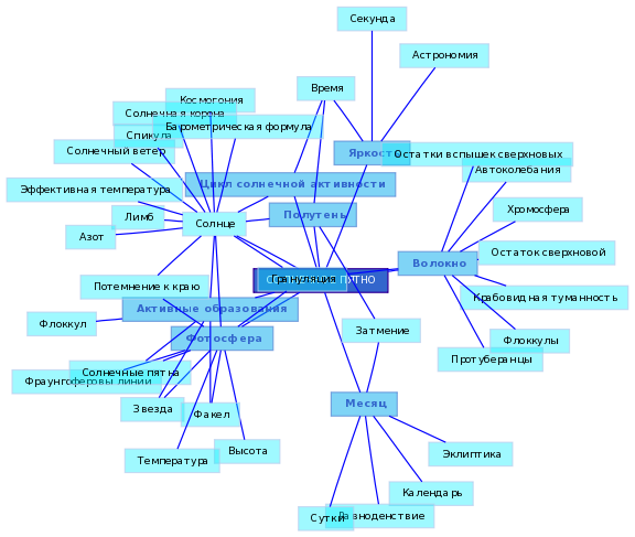 Относительно холодная область в фотосфере Солнца (T = 4500 K), которая выглядит как темное пятно на фоне более горячей фотосферы (T = 5800 K). У хорошо развитого пятна выделяется более темная центральная часть ("тень") и менее темная периферия ("полутень"), состоящая из радиально ориентированных волокон разной яркости.Сурдин В.Г., ГАИШ, Москва