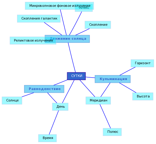 Интервал времени между двумя последовательными верхними кульминациями избранной точки на небесной сфере. Для звездных суток это точка весеннего равноденствия, для солнечных суток - расчетная точка положения среднего Солнца.Видимое движение Солнца по небу задает истинные солнечные сутки, как интервал между двумя последовательными прохождениями Солнца через меридиан в нижней кульминации. Если бы это движение отражало только вращение Земли вокруг своей оси, то оно происходило бы очень равномерно. Но оно связано также с неравномерным движением Земли вокруг Солнца и с наклоном земной оси, поэтому истинные солнечные сутки переменны. Для измерения времени в быту и в науке используется математически вычисленное положение "среднего солнца" и, соответственно, средние солнечные сутки - интервал между двумя последовательными прохождениями среднего солнца через меридиан в нижней кульминации. Средние солнечные сутки имеют постоянную длину.