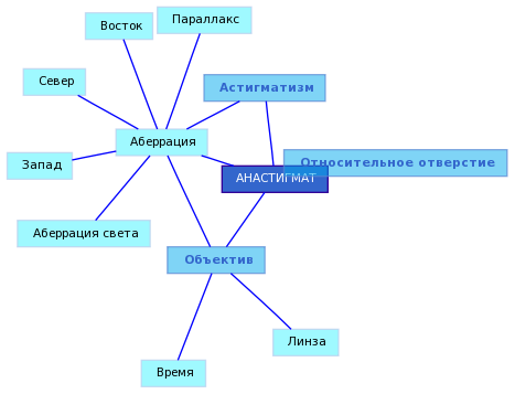 Наиболее совершенный тип объектива (преимущественного фотографического), характеризующийся исправлением аберраций в пределах всего поля изображения. Существенным признаком анастигмата является исправление астигматизма и кривизны поля изображения. Разрешающая способность у анастигмата в центре поля достигает 70 штрих/мм, на периферии - 40 штрих/мм. Относительное отверстие - до 1:1.