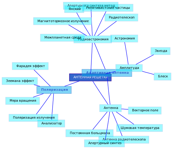 Совокупность дискретных элементов, каждый из которых осуществляет когерентно по отношению к остальным излучение или прием электромагнитных волн. Простейшими элементами антенной решетки служат отдельные, обычно слабонаправленные, антенны (вибраторы, щели, спирали, открытые концы волноводов, рупоры и т. п.). Иногда отдельные элементы решетки также являются составными, содержащими несколько одинаковых или разнотипных излучателей. В передающей антенной решетке элементы подсоединяются к источнику электромагнитных колебаний с помощью системы, осуществляющей возбуждение волн. В режиме приема элементы антенной решетки соединяются с приемным устройством системой суммирования принимаемых сигналов. Система возбуждения может быть многоканальной, причем ее различным каналам соответствуют различные распределения поля на элементах, а следовательно, и различные диаграммы направленности (ДН) антенной решетки. В антенных решетках используется фидерный или пространственный способ возбуждения элементов. В первом случае элементы соединяются с передатчиком через линии передачи, во втором - через пространство по схемам линзовой и зеркальной антенн. Аналогично выполняются системы суммирования принимаемых сигналов.