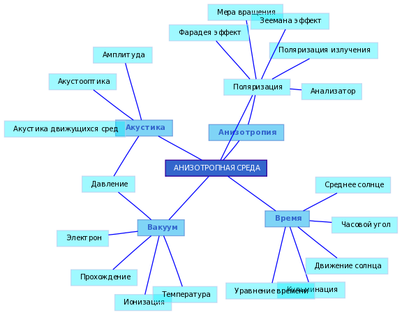Среда, макроскопические свойства которой различны в различных направлениях, в противоположность среде изотропной, где они не зависят от направления. Формально анизотропия однородной безграничной среды означает неинвариантность ее свойств относительно группы вращений. Поскольку у реальной среды обычно есть границы, при строгом подходе к определению анизотропии необходимо иметь в виду не абстрактную безграничную среду, а сделанный из этой среды макроскопически однородный шар. Среду следует считать анизотропной, если существует экспериментально обнаружимый поворот вокруг центра указанного шара.