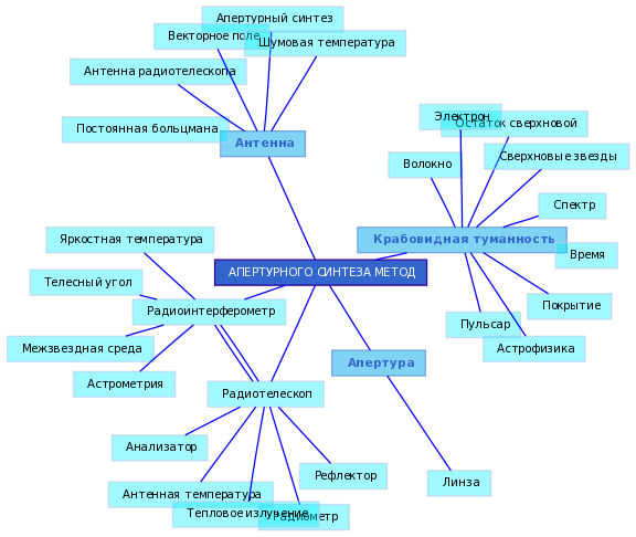 АПЕРТУРНОГО СИНТЕЗА МЕТОД - позволяет получить распределение радиояркости космич. объектов с высоким угловым разрешением. Разрешение совр. даже самых больших одиночных радиотелескопов, размеры зеркал к-рых достигают 50-100 м, составляет всего лишь 1-2'. Дальнейшее повышение разрешающей силы за счёт увеличения размеров зеркал ограничено неизбежным прогибом антенн под действием собственного веса. Существенно большее угловое разрешение может быть получено А. с. м. Распределение радиояркостн объекта - различие в интенсивности излучения отдельных его участков - может быть представлено разложением на отдельные гармоники, т. е. синусоидальные пространственные колебания разной частоты (разложением в ряд Фурье). Амплитуды гармоник и их фазы измеряются на радиоинтерферометре с базой переменной длины и ориентации. Длина и ориентация базы определяют частоту пространственной синусоиды, к-рую выделяет интерферометр из излучения измеряемого объекта. Последовательные наблюдения радиоисточника с базами разной длины и ориентации позволяют измерить амплитуды и фазы гармоник. Суммируя полученные гармоники с учётом их фазы, находят распределение радиояркости исследуемого объекта (синтезируют изображение). Поскольку длина базы может существенно превышать размер одиночной антенны, А. с. м. эквивалентен наблюдениям на антенне с громадными размерами (с высоким разрешением) или, как говорят, на телескопе с большой апертурой (действующей площадью). Но высокое разрешение достигается ценой большого времени наблюдений. Этим методом были получены распределения радиояркости многих объектов, в т. ч. объектов Лебедь А, Кассиопея А, Телец А (Крабовидная туманность) и др. Разрешение достигало 20", а в ряде случаев даже неск. угловых секунд. Для сокращения времени наблюдений используют многоэлементные системы, образующие одновременно большое число баз разной длины и ориентации. К таким инструментам относится большая антенная решётка (VLA - Very Large Array) Национальной радиоастрономич. обсерватории в Нью-Мексико (США); её 27 антенн диаметром 25 м каждая расположены вдоль образующих в виде буквы Y. Разрешение инструмента достигает 1" на длине волны 10 см. Наблюдения на радиоинтерферометрах со сверхбольшими базами позволяют получить изображение радиоисточника с угловым разрешением до 100 мкс дуги. Но и это не предел, вывод одного из радиотелескопов на орбиту вокруг Земли позволит значительно увеличить базу и достигнуть ещё более высокого углового разрешения.