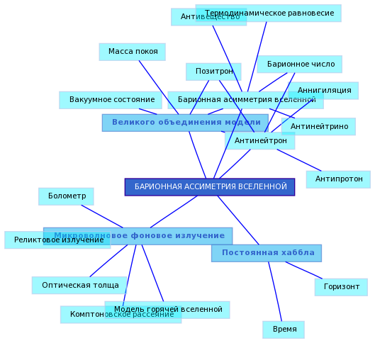 Иными словами, на каждый миллиард антибарионов в плазме содержался миллиард барионов и ещё один барион. В дальнейшем при расширении и охлаждении плазмы каждая частица нашла себе партнёра, с к-рым и проаннигилировала, образовав в конечном счёте фотоны. Эти фотоны и составляют значит. часть наблюдаемого сейчас реликтового радиоизлучения (см. Микроволновое фоновое излучение). "Лишние" же протоны и нейтроны, не найдя себе напарника для аннигиляции, послужили в дальнейшем "строительным материалом" нашего мира.