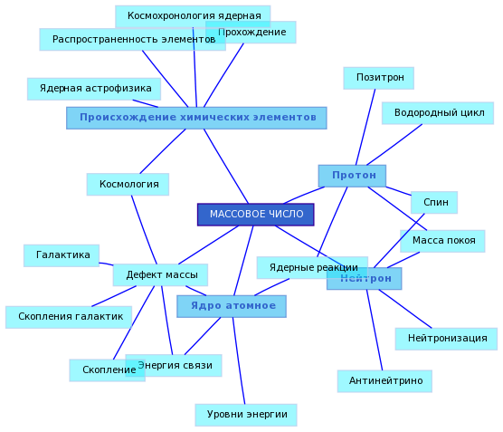 A - полное число нуклонов, т.е. протонов и нейтронов, в атомном ядре (см. Ядро атомное). В обозначениях элементов пишется слева вверху от символа элемента, напр. 16О. По определению, A= Z + N, где Z - заряд ядра, т.е. число протонов, N - число нейтронов в ядре. Отличие массы одного грамм-атома данного изотопа от М. ч. представляет собой дефект массы по отношению к углероду 12С. Углерод 12С принят за стандарт измерения атомной единицы массы (а. е. м.) в масс-спектроскопии, его атомная масса принимается за 12 единиц. Т.к. дефект масс всех ядер значительно меньше а. е. м., то у всех известных изотопов М. ч. есть ближайшее целое число к атомной массе элемента. Во всех ядерных реакциях и радиоактивных процессах сумма М. ч. исходных частиц равна сумме М. ч. конечных частиц, что отражает закон сохранения барионного заряда. При бета-процессе М. ч. остаётся постоянным, изменяется только соотношение между числом нейтронов и протонов в ядре. М. ч. увеличивается на единицу при захвате нейтрона с испусканием фотона. В астрофизике такое явление имеет место при образовании хим. элементов в s- и r-процессах нейтронного захвата (см. также Происхождение химических элементов). Изотопы разных элементов, имеющие ядра с различным зарядом, но с одинаковым М. ч., наз. изобарами. Элемент с наибольшим дефектом масс при данном М. ч. явл. стабильным по отношению ко всем процессам слабого взаимодействия. При нечётном М. ч. зависимость полной энергии ядра от Z имеет один минимум. При A четном с изменением Z чередуются четно-чётные и нечётно-нечётные ядра, зависимость полной энергии ядра от Z имеет неск. минимумов, отвечающих неск. стабильным изобарам. Отличие хим. св-в различных изотопов ведёт в астрофизике к важному эффекту их фракционирования. При ядерной плотности вещества в недрах нейтронной звезды наряду с нейтронами могут присутствовать сильно переобогащённые нейтронами изотопы.(М.Ю. Хлопов)