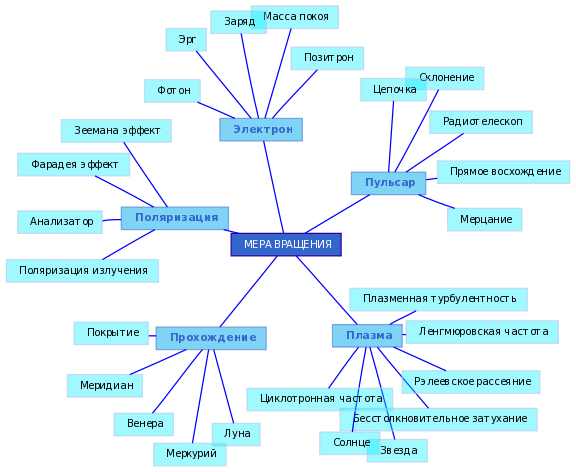 RM - величина, определяющая угол поворота плоскости поляризации плоскополяризованного радиоизлучения при прохождении его через плазму с магн. полем (см. Поляризация электромагнитного излучения). Вращение плоскости поляризации возникает из-за эффекта Фарадея и быстро растёт с длиной волны. Угол поворота плоскости поляризациичерта сверху обозначает среднее значение, dl - элемент длины вдоль луча зрения, L - расстояние до источника излучения, Ne - концентрация электронов, B|| - компонент магн. поля вдоль луча зрения (значение B|| выражено в микрогауссах, Ne - в см-3, L - в пк, RM - в рад/м2).