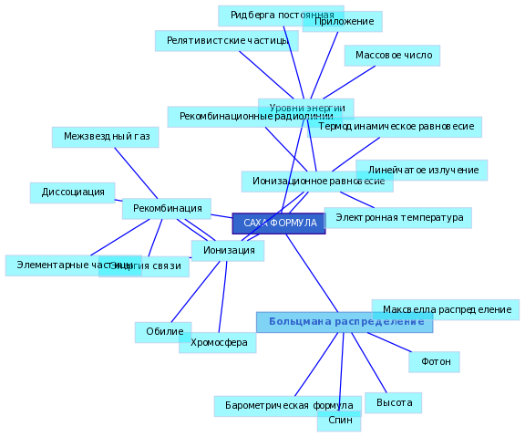 где gn(z) - т.н. статистич. вес уровня n иона Xz, En - энергия иона на уровне n (относительно осн. состояния). В сумму (2) фактически вносят вклад лишь уровни с En < kT. При z=1 ф-ла (1) дает соотношение между концентрациями нейтральных атомов X1=X I и первых ионов X2=X II (однократно ионизованных атомов или молекул). Комбинируя ф-лу (1) с ф-лой Больцмана (см. Больцмана распределение), можно получить соотношение между числом ионов, населяющих конкретные уровни энергии n и p,