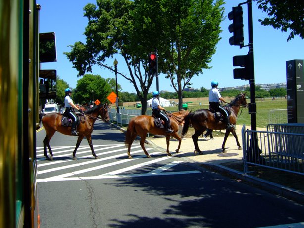 Jefferson memorial. Mounted police. White House, the USA president palace. White House back side and tourists. Securities on the roof.
