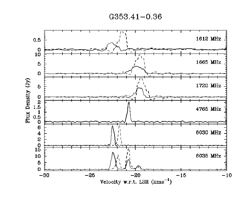 The main limitation on these observations is the spectral resolution of the ATCA correlator at low frequencies. Ideally we would like 0.1 kms-1 velocity resolution and full polarisation information for all transitions. Currently the best velocity resolution which can be achieved with full polarisation for the 1.6-GHz transitions is 0.7 kms-1 and it is this which leads to the "ringing" which is visible in the 1612, 1665 & 1720-MHz spectra. The 2-GHz correlator, to be built with funding from MNRF-II will overcome this limitation and in conjunction with the MNRF-I frequency upgrade will enable unprecedented ability to collect quasi-simultaneous, high spatial and spectral resolution full polarisation spectra of many OH (and methanol) maser transitions.