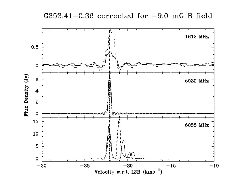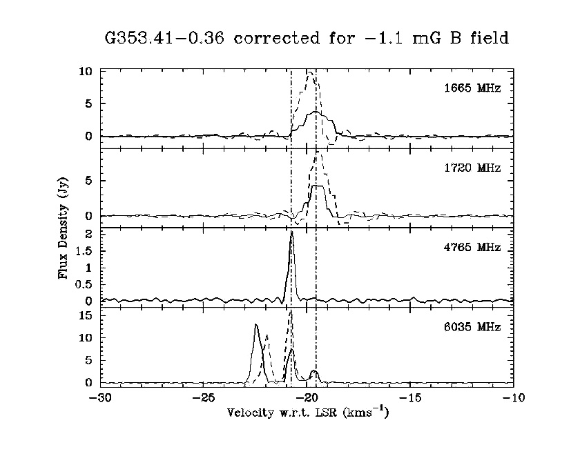 G353.41-0.36, after the velocities have been corrected for the effects of Zeeman splitting. The vertical lines