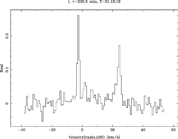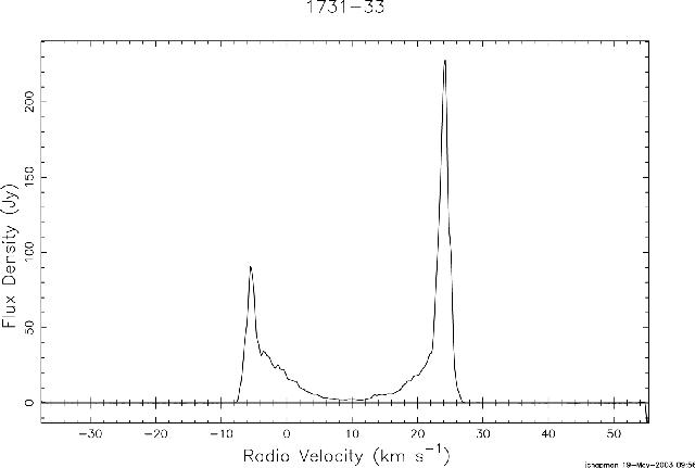 More recently, in November 2004 we obtained a detection of H2O maser emission from V1018 Sco, from a short Compact Array observation. The spectrum shows two maser emission features at velocities of 2.4 and +25 km s-1 (Figure 4). In AGB stars, the water masers are collisionally excited in the inner, denser regions of the circumstellar shells, at densities up to 1011 cm-3. In general the water masers are located closer to the stars than the OH masers. However, for a small number of post-AGB stars, high velocity water maser emission has been detected that is associated with high-velocity, collimated molecular outflows. In such cases the water masers may be located beyond the OH maser region. An excellent example of this is seen in the AGB star W43A (Imai et al. 2002). Such jet-like flows may mark the beginning of the transition of an AGB star to becoming a planetary nebula, and play an important role in shaping the planetary nebulae.