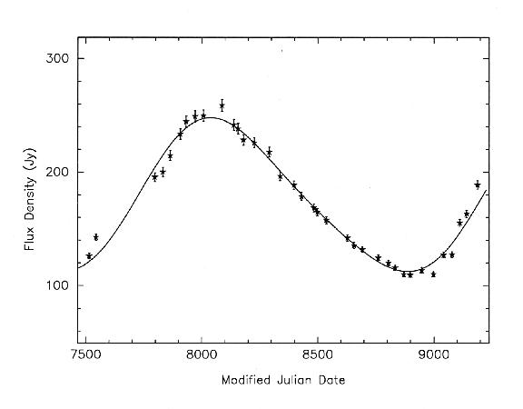 Figure 2 shows an OH light curve of V1018 Sco, obtained from 36 epochs of Parkes monitoring data, over a five-year period. The light curve shows that the star is a large-amplitude, long-period variable with an exceptionally long pulsation period of 1486 days. The light travel time across the OH envelope has been obtained using a phase lag technique (Chapman et al. 1995). The measured phase lag of 60 days corresponds to a linear size of the OH shell of 11,000 AU. The phase-lag linear diameter and the angular diameter yield a stellar distance of 3.2 kpc, with an estimated precision of about 20%.