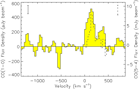 shown filled and the J=5-4 transition is overlaid with a dashed line. One-sigma thermal noise bars are shown