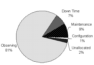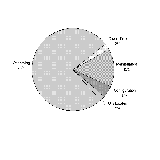 The charts below (figure 1) outlines details of Compact Array usage for the 2000 January and 2000 May Observing Terms. During 00JANT there was a larger than usual amount of down time (7%). This was due to two independent failures: an azimuth gearbox failure on antenna #2; and a major electrical fault occurring on antenna #6.