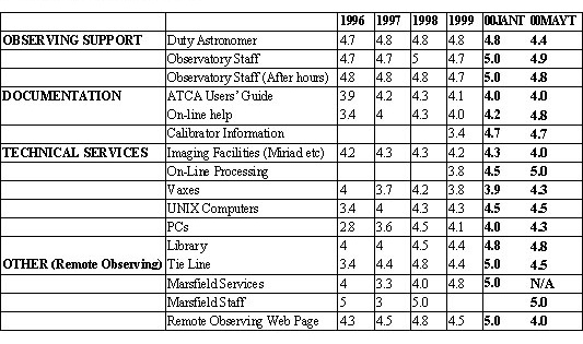 Observers at the Compact Array are asked to assess the quality of support at the Observatory by rating a number of services on a scale of one to five. The table above (Table 1) gives a summary of User questionnaires for the years 1996 to 1999 and for the 2000 January and 2000 May observing terms.
