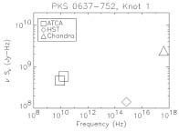 Compact Array 3 and 6-cm images of PKS 0637-752 show a bright westward-pointing jet coincident with the X-ray emission discovered by Chandra. The straight jet ends in a northward bend past which no X-rays are detected. It is also at this bend where the radio polarisation electric vectors begin to rotate from perpendicular to the jet to parallel. Archival HST data revealed three previously overlooked unresolved features at 27th magnitude coincident with the brightest parts of the X-ray and radio jets (Figure 1). These observations have allowed the emission mechanism of the jet to be investigated. The observed Spectral Energy Distribution (SED) of one of the jet features is shown in Figure 2. While the radio jet is undeniably due to synchrotron radiation because of the high linear polarisation, the emission mechanism of the X-ray jet is less clear.
