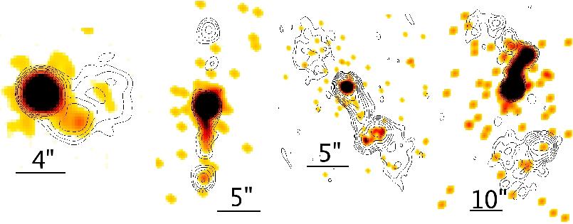 shown as contours and X-ray data convolved to the same resolution are shown as pixels. From left to right the sources