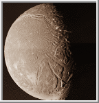 Ariel [AIR-ee-al] is a relatively small satellite and is the brightest moon of Uranus. The surface is pock-marked with craters, but the most outstanding features are long rift valleys stretching across the entire surface. Canyons much like the ones on Mars appear in the pictures. The canyon floors appear as though they have been smoothed by a fluid. The fluid could not have been water because water acts like steel at these temperatures. The flow marks might have been made by ammonia, methane or even carbon monoxide.