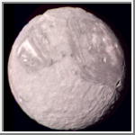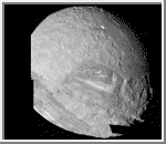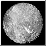 Miranda is a small satellite with a diameter of 470 kilometers (290 miles). Its surface is unlike anything in the solar system with features that are jumbled together in a haphazard fashion. Miranda consists of huge fault canyons as deep as 20 kilometers (12 miles), terraced layers and a mixture of old and young surfaces. The younger regions might have been produced by incomplete differentiation of the moon, a process in which upwelling of lighter material surfaced in limited areas. Alternatively, scientists believe that Miranda may have been shattered as many as five times during its evolution. After each shattering the moon would have reassembled from the remains of its former self with portions of the core exposed and portions of the surface buried. Miranda's appearence can be explained by theories, but the real reason is still unknown.