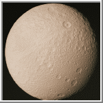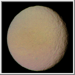 Tethys [TEE-this] was discovered by Giovanni Cassini in 1684. It is an icy body similar in nature to Dione and Rhea. The density of Tethys is 1.21 gm/cm3, indicating that it is composed almost entirely of water-ice. Tethys's icy surface is heavily cratered and contains cracks caused by faults in the ice. There is one enormous trench on Tethys about 65 kilometers (40 miles) wide and extending from above the center to the extreme left. It covers three-fourths of Tethys' circumference. The fissure is about the size scientists would predict if Tethys were once fluid and its crust hardened before the interior. The canyon has been named Ithaca Chasma. A vast expanse of relative young plains also exists on Tethys. Tethys' surface temperature is -187° C (-305° F).