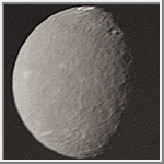 Umbriel [UM-bree-ul] is the darkest satellite of Uranus. It is about the same size as Ariel and has about the same density. The surface appears to be old with large craters and does not change much from one location to another. Near the top is a puzzling bright ring called the fluorescent cheerio. It is probably the floor of a crater.