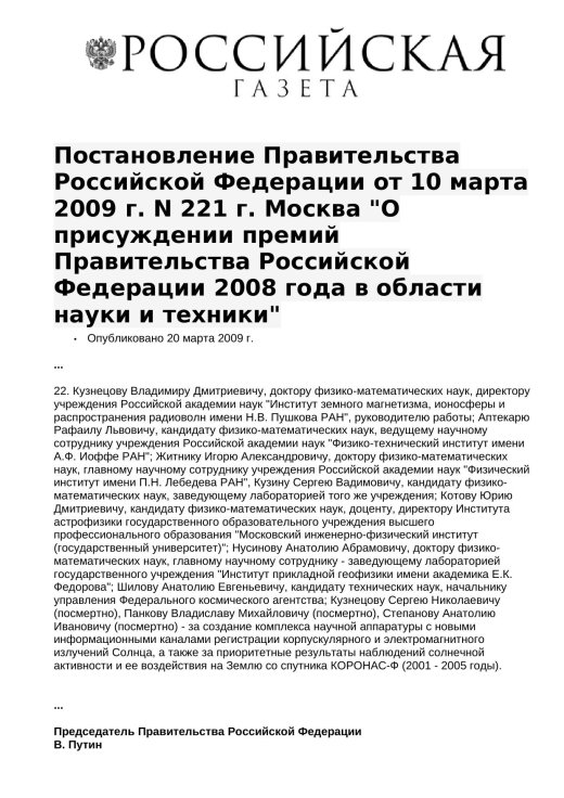 the 2008 Russian Federation Government Prize in the Field of