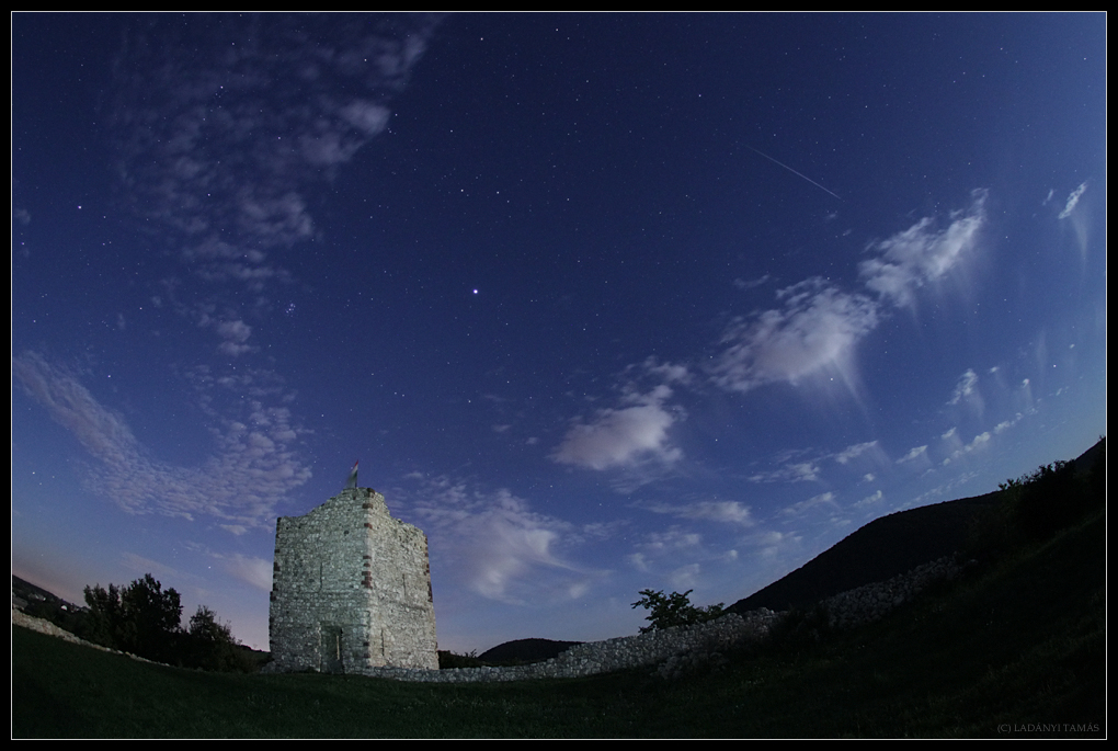 Explanation: Each August, as planet Earth swings through dust trailing along the orbit of periodic comet Swift-Tuttle, skygazers enjoy the Perseid Meteor Shower. As Earth moves through the denser part of the comet's wide dust trail this year's shower peaks around 6:00 UT August 13 (this morning), when light from a nearly full Moon masks all but the brighter meteor streaks. Still, Perseid meteors can be spotted in the days surrounding the peak. Moonlight and a Perseid meteor created this gorgeous skyscape, recorded in a simple, single, 10 second long exposure on the morning of August 12. Below the moonlit clouds in the foreground are the ruins of a medieval castle near Veszprem, Hungary, seen against the Bakony mountain range. In the night sky above the clouds, the Perseid meteor's trail is joined by bright planet Jupiter near the center of the frame along with the lovely Pleiades star cluster at the left.