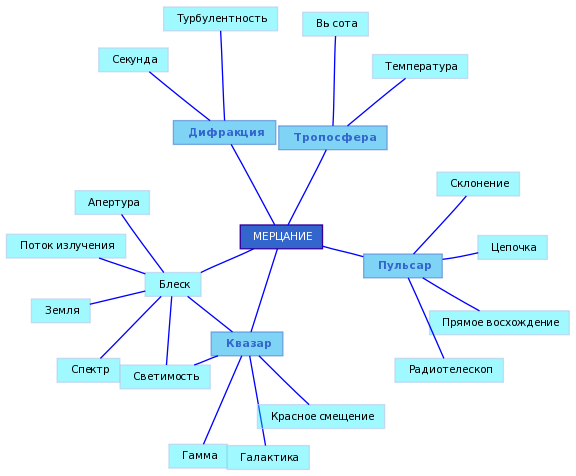 Наблюдаемое нерегулярное изменение интенсивности излучения космических источников из-за его рассеяния на подвижных неоднородностях промежуточной среды. Например, хаотическое изменение оптического блеска звезд ("мигание" звезд), вызванное преломлением и дифракцией их света в турбулентных слоях земной атмосферы. Мерцание космических радиоисточников (пульсаров, квазаров) в основном связано с неоднородностью межзвездной и межпланетной плазмы. Мерцание не только создает помехи наблюдениям, но и позволяет оценить угловой размер источника и характеристики рассеивающей его излучение среды. Так, планеты, в отличие от звезд, не мерцают, поскольку имеют больший угловой размер, превышающий характерный угловой размер неоднородностей воздуха в верхних слоях тропосферы.Сурдин В.Г., ГАИШ, Москва