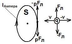 Вот система магнит-диск (или просто - проводящий магнит) вращается на валу. Обозначены ток Ампера (Ia) магнита, заряд (q), ЭДС (Е), обусловленная вращением диска, сила Лоренца (Л), действующая на заряд, движущийся под влиянием ЭДС, реакция силы Лоренца (Р), действующая на магнит (на ток Ампера), направление вращения системы (стрелка W):