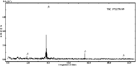 To identify pulsation or oscillation frequencies of TIC 372275195 based on its brightness variations, a frequency analysis was performed using the Period04 software (Lenz & Breger 2005). To improve the signal-to-noise ratio (SNR) in the TESS observations, data sequences with 1800-second exposures from Sectors 18 and 19 were combined, including the parameters BJD/TIME and KSPSAP_FLUX (Kepler Spline Simple Aperture Photometry), together with the corresponding uncertainties KSPSAP_FLUX_ERR (Vanderburg & Johnson 2014). A similar procedure was applied to the datasets with 200-second exposures from Sectors 58, 59, and 86. The amplitude spectrum of TIC 372275195 was constructed using BJD/TIME, DET_FLUX, and DET_FLUX_ERR from TESS Sector 59 (Fig. 3).